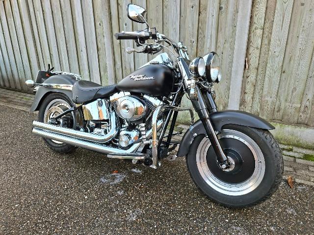 Compleet kenteken Harley Davidson FLSTF Fat Boy uit 2001 in matzwarte uitvoering met krachtige 1450cc motorblok. Voorzien van Vance & Hines uitlaatsysteem hydraulische koppeling smoke knippers en custom zadel. Zwarte lederen koffers en veel chroomdetails maken het geheel compleet. Zichtbare gebruikssporen op enkele delen verder nette en stoere uitstraling.