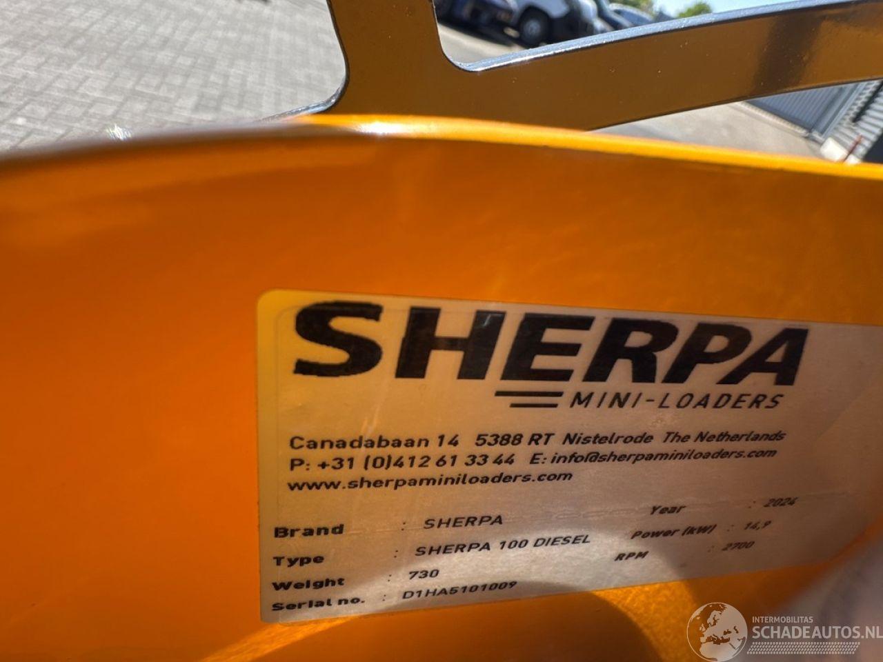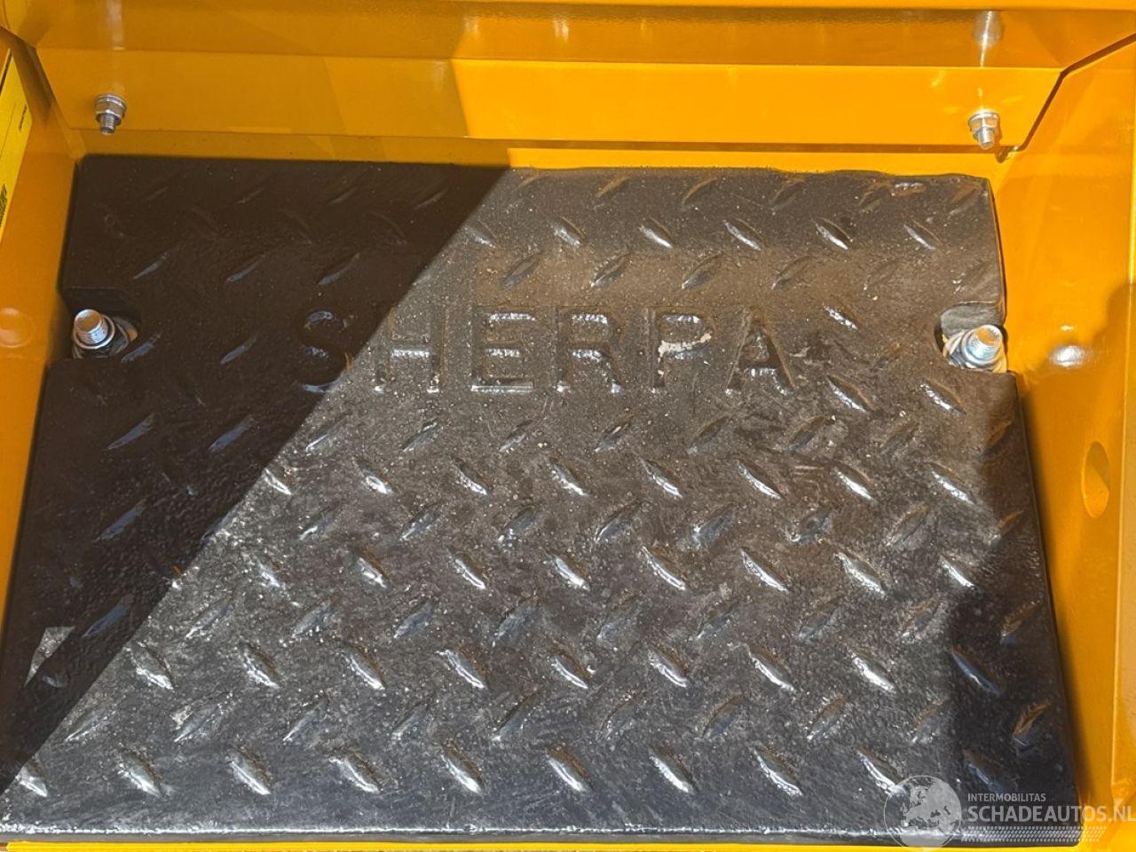 de SHERPA 100 Standaard doet het zonder aarzelen. Bovendien is de SHERPA 100 gemakkelijk te vervoeren op een aanhangwagen of in een bestelbusje. Er is dus geen speciaal vervoer nodig. Motor Fabrikant Honda Type GX630 Vermogen 15.5/20.8 kW/pk Max. Toerental 3600 rpm Afgesteld toerental 2650 rpm Aantal cilinders 2 Koeling Luchtgekoeld Brandstof Benzine (Euro95) Brandstoftankinhoud 16 l Aandrijving Hydrostatisch d.m.v. 2 hydraulische wielmotoren Snelheid 315 cc wielmotoren 0-10 (traploos) km/h* Snelheid 400 cc wielmotoren 0-8 (traploos) km/h* Vermogensgegevens Opbreekkracht 675 kg Duw- trekkracht 315 cc wielmotoren 340 kg* Duw- trekkracht 400 cc wielmotoren 420 kg* Rij- en werkhydrauliek 29 l/min - 190 bar Hydrauliektankinhoud 45 l Banden Standaard 20x11.00-8 - Tractor profielbanden breed Smal 4.00-10 - Tractor profielbanden smal Remmen Bedrijfsrem Hydrostatisch op 2 achterwielen/ 2 voorwielen d.m.v. kettingoverbrengingen Besturing Schrankbesturing Afmetingen in mm Maximale hoogte bak 2600 Hoogte scharnierpunt koppelplaat 2105 Hoogte bovenop scharnier hefarm 1250 Lengte+bak 2112 Hoek bak bij kiepen 51º Hoogte onderzijde bak bij kiepen 1560 Lengte voorwiel tot bak bij kiepen 60 Hoogte bak horizontaal 1930 Hoek bak laag 26º Hoek bak hoog 53º Wielbasis 657 Lengte tot koppelplaat 1508 Grondspeling 176 Hoek achterzijde 23º Schrankcirkel 1690 Schrankcirkel met bak 2265 Breedte 1140