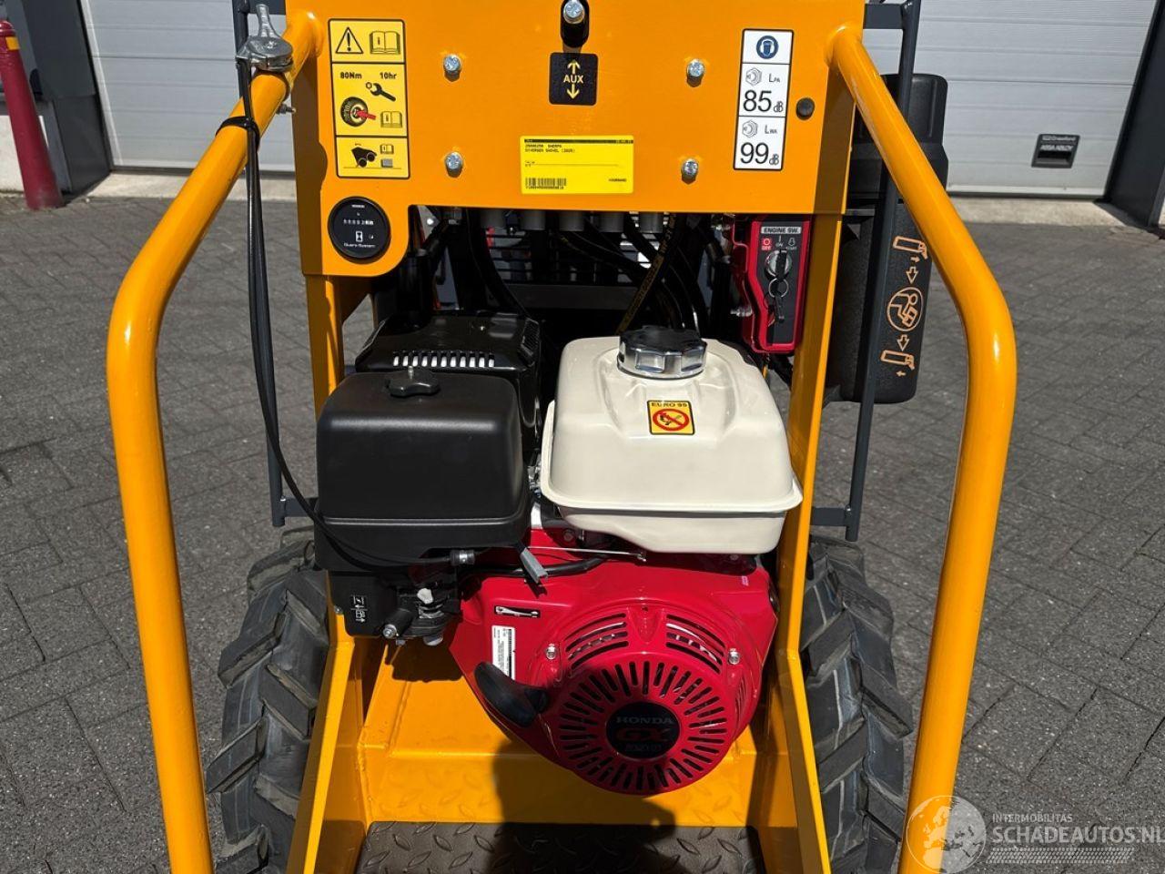 - exclusief btw totaalprijs verkoop Sherpa inclusief hydraulische pelikaanbak : €15.850 ex btw Maximale hoogte bak 2545 Hoogte scharnierpunt koppelplaat 2050 Hoogte bovenop scharnier hefarm 1195 Lengte+bak 2165 Hoek bak bij kiepen 51º Hoogte onderzijde bak bij kiepen 1480 Lengte voorwiel tot bak bij kiepen 180 Hoogte bak horizontaal 1860 Hoek bak laag 26º Hoek bak hoog 53º Wielbasis 657 Lengte tot koppelplaat 1520 Grondspeling 121 Hoek achterzijde 14º Schrankcirkel 1606 Schrankcirkel met bak 2250 Breedte 760 Gewicht rijklaar 570 kg (met standaard banden Motor Fabrikant Honda Type GX390 Vermogen 8.7 /11.7 kW/pk Max. Toerental 3600 rpm Afgesteld toerental 3000 rpm Aantal cilinders 1 Koeling Luchtgekoeld Brandstof Benzine (Euro95) Brandstoftankinhoud 6