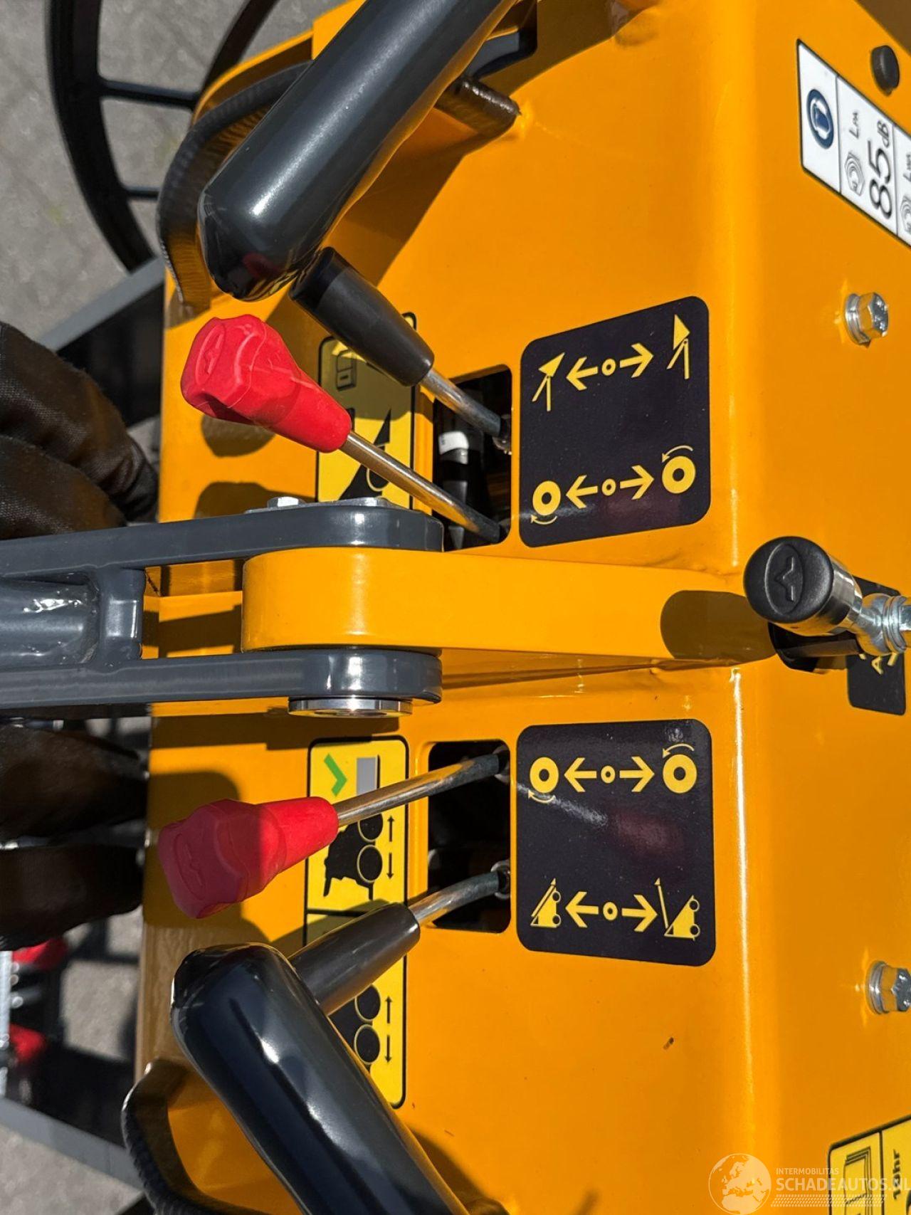 5 (traploos) km/h* Vermogensgegevens Opbreekkracht 690 kg Duw- trekkracht 370 kg* Rij- en werkhydrauliek 24 l/min - 190 bar Hydrauliektankinhoud 38 l Banden Standaard 4.00x10 - Tractor profielbanden Breed 20x11.00-8 - Tractor profielbanden Remmen Bedrijfsrem Hydrostatisch op 2 achterwielen/ 2 voorwielen d.m.v. kettingoverbrengingen Besturing Schrankbesturing Afmetingen in mm Maximale hoogte bak 2545 Hoogte scharnierpunt koppelplaat 2050 Hoogte bovenop scharnier hefarm 1195 Lengte+bak 2165 Hoek bak bij kiepen 51º Hoogte onderzijde bak bij kiepen 1480 Lengte voorwiel tot bak bij kiepen 180 Hoogte bak horizontaal 1860 Hoek bak laag 26º Hoek bak hoog 53º Wielbasis 657 Lengte tot koppelplaat 1520 Grondspeling 121 Hoek achterzijde 14º Schrankcirkel 1606 Schrankcirkel met bak 2250 Breedte 760