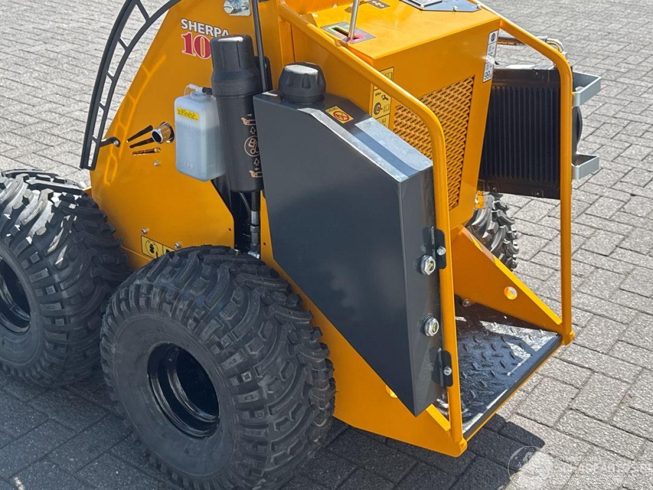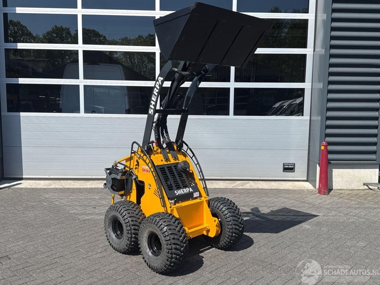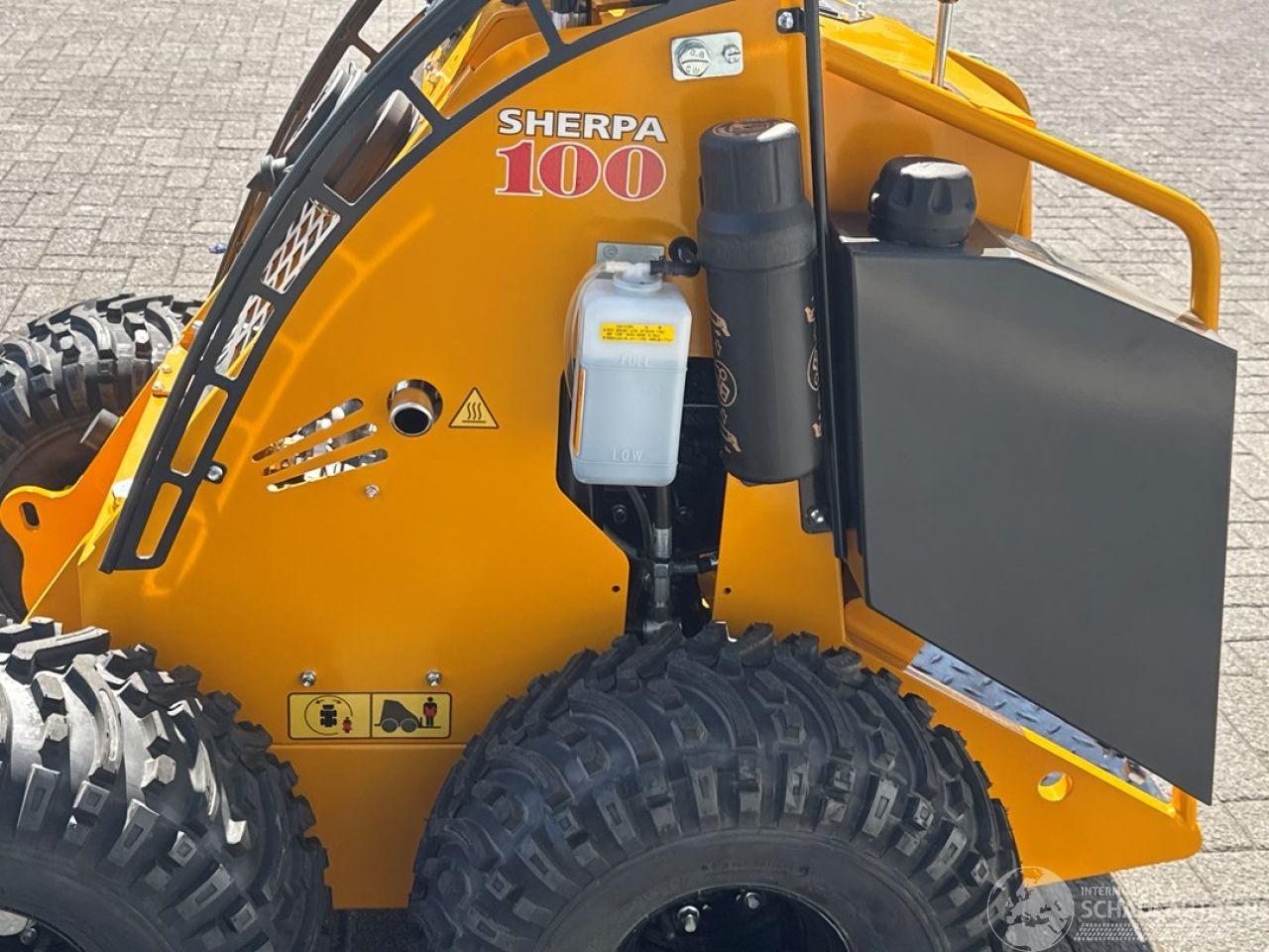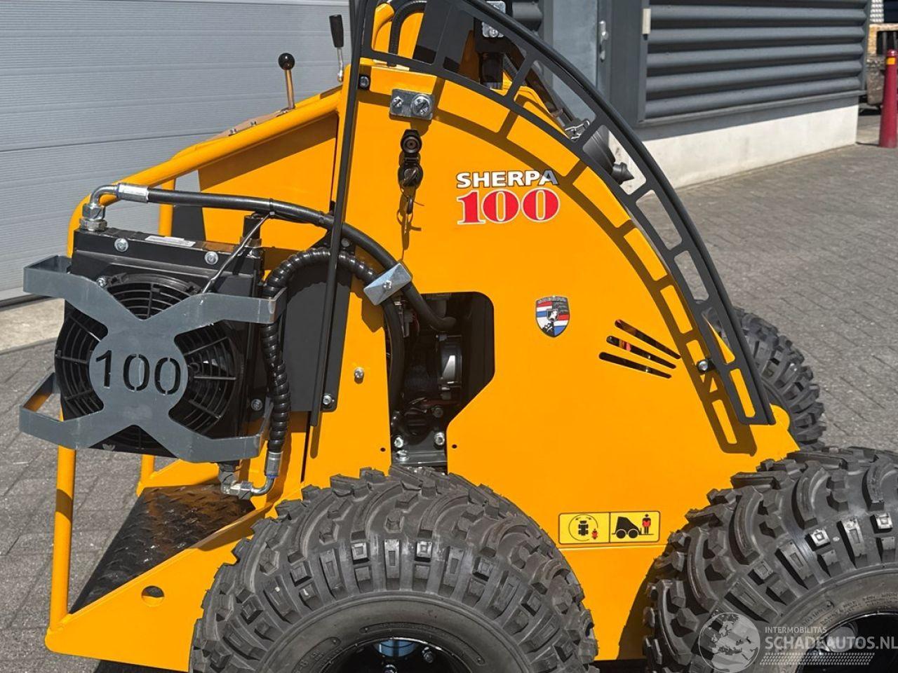 de SHERPA 100 Standaard doet het zonder aarzelen. Bovendien is de SHERPA 100 gemakkelijk te vervoeren op een aanhangwagen of in een bestelbusje. Er is dus geen speciaal vervoer nodig. Motor Fabrikant Honda Type GX630 Vermogen 15.5/20.8 kW/pk Max. Toerental 3600 rpm Afgesteld toerental 2650 rpm Aantal cilinders 2 Koeling Luchtgekoeld Brandstof Benzine (Euro95) Brandstoftankinhoud 16 l Aandrijving Hydrostatisch d.m.v. 2 hydraulische wielmotoren Snelheid 315 cc wielmotoren 0-10 (traploos) km/h* Snelheid 400 cc wielmotoren 0-8 (traploos) km/h* Vermogensgegevens Opbreekkracht 675 kg Duw- trekkracht 315 cc wielmotoren 340 kg* Duw- trekkracht 400 cc wielmotoren 420 kg* Rij- en werkhydrauliek 29 l/min - 190 bar Hydrauliektankinhoud 45 l Banden Standaard 20x11.00-8 - Tractor profielbanden breed Smal 4.00-10 - Tractor profielbanden smal Remmen Bedrijfsrem Hydrostatisch op 2 achterwielen/ 2 voorwielen d.m.v. kettingoverbrengingen Besturing Schrankbesturing Afmetingen in mm Maximale hoogte bak 2600 Hoogte scharnierpunt koppelplaat 2105 Hoogte bovenop scharnier hefarm 1250 Lengte+bak 2112 Hoek bak bij kiepen 51º Hoogte onderzijde bak bij kiepen 1560 Lengte voorwiel tot bak bij kiepen 60 Hoogte bak horizontaal 1930 Hoek bak laag 26º Hoek bak hoog 53º Wielbasis 657 Lengte tot koppelplaat 1508 Grondspeling 176 Hoek achterzijde 23º Schrankcirkel 1690 Schrankcirkel met bak 2265 Breedte 1140