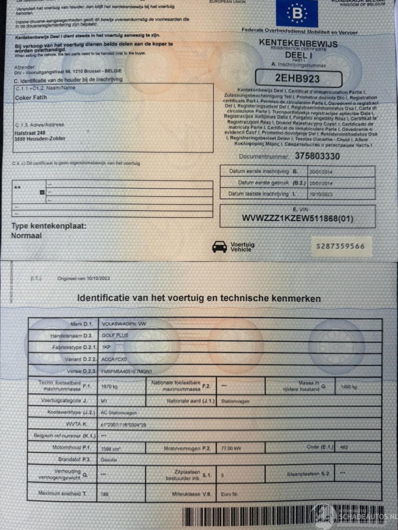 Număr șasiu: WVWZZZ1KZEW51****
